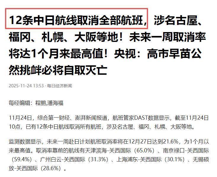 就在这些行动密集进行的同时,中日之间的航线突然大范围取消,“航班管家DAST”数据显示,11月24日上午10点起,已有12条中日航线停止运行,航班全部取消。