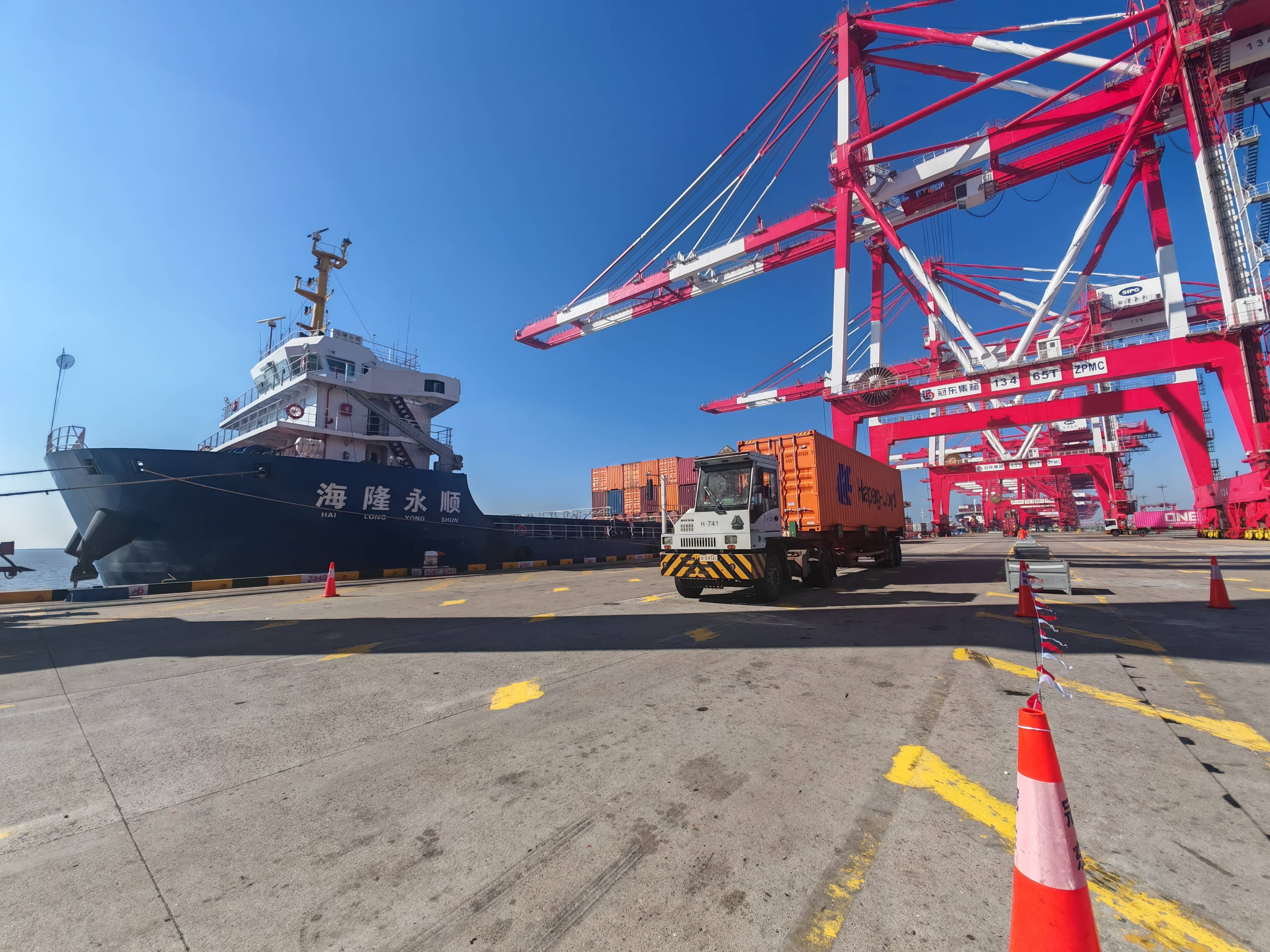 停泊在上海洋山三期码头的“海隆永顺号”集装箱船。(受访者供图)上港集团相关负责人介绍,从芜湖开往洋山港区和外高桥港区的2条航线均全程直达、无中途挂靠,航期由此前5天至6天缩短到2.5天至3天,提升了运输链路的连贯性与稳定性。