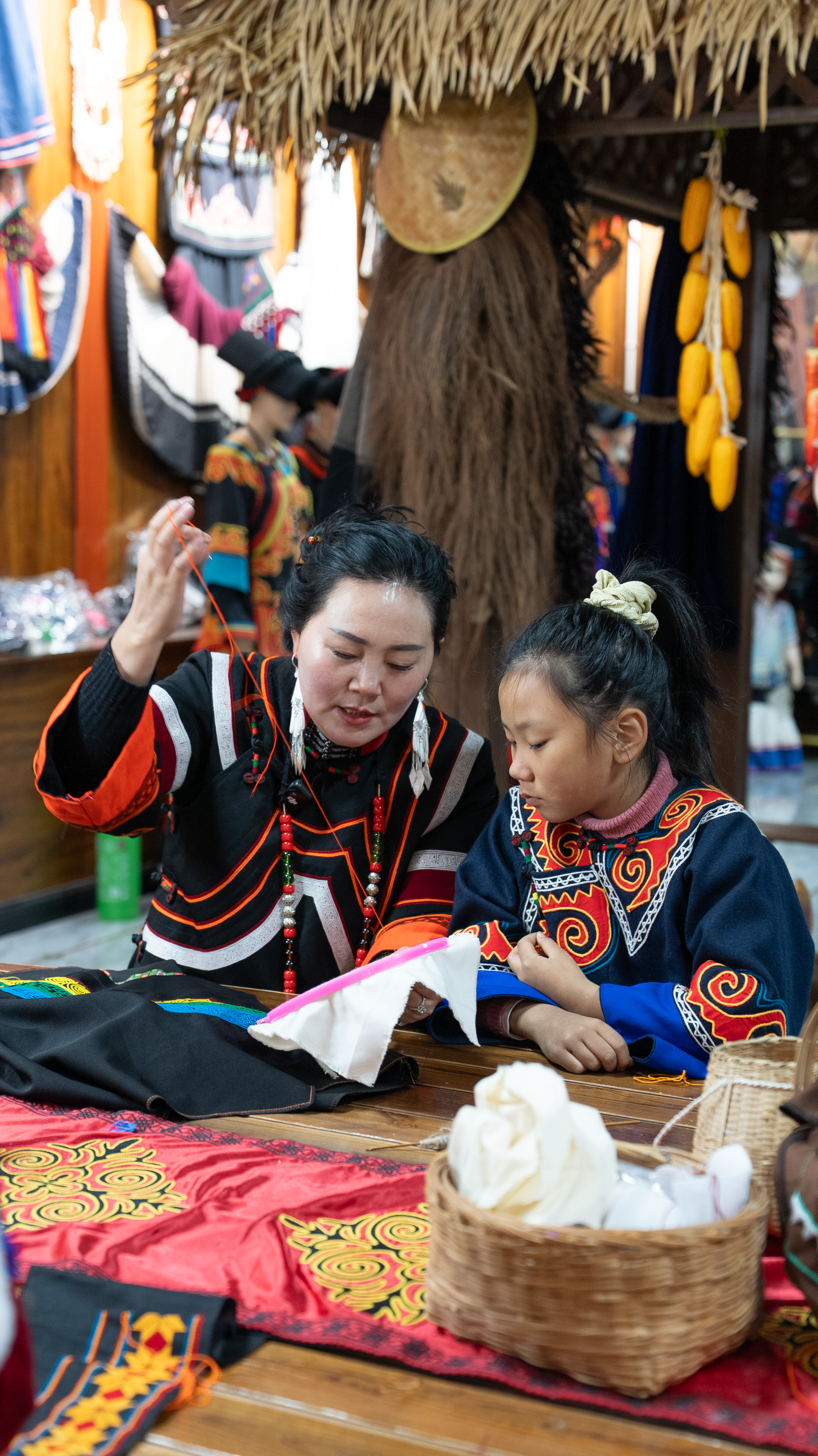 为此,她每年赴京参会的行李都是姐妹们一起完成的,从衣服的花纹寓意到配饰的搭配。这也是绣娘尼尼阿果最喜欢的一件事,个性腼腆的她有着一手好绣技,作为最早加入合作社的绣娘之一,最近她会细声细气地跟大家说起自己给女儿报的寒假兴趣班。尽管生活费学费是一笔不算小的支出,但这位母亲给得毫不犹豫。“我用自己刺绣挣的钱,很畅快。”尼尼阿果讲起付钱的那个瞬间时,语气是按捺不住的自豪,“觉得腰杆特硬,真好。”